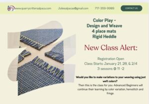 There are many other classes to learn what to do with an alpaca fleece. We offer skirting classes, spinning classes choose from using a drop spindle or a spinning wheel. There are visiting teachers that have joined us at Quarry Critters Learning Studio. Weaving is now being offered on a rigid heddle.