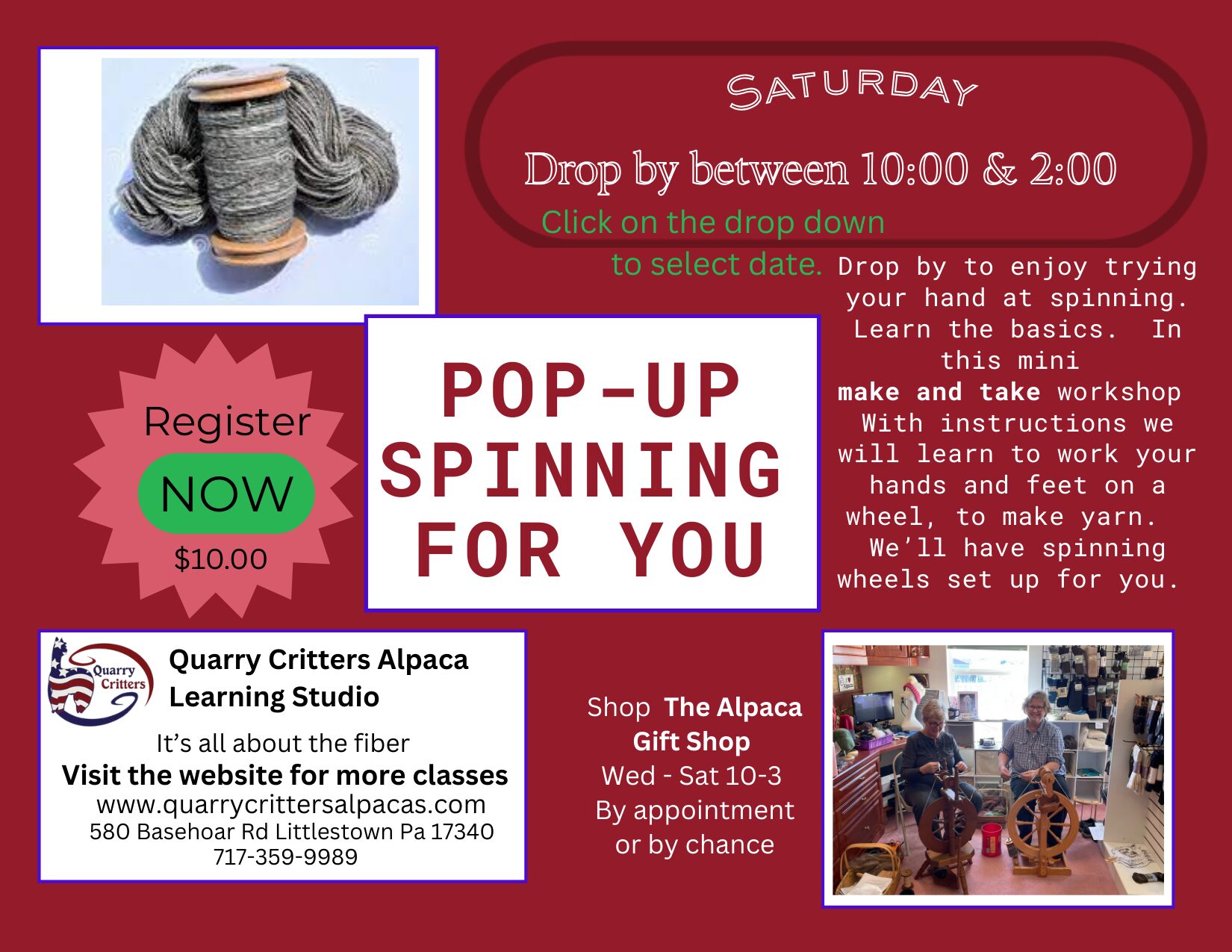 This class is an introduction to our Beginning Spinning class that will start on a Friday following the pop – up preview. Check the website for the best time for you to start spinning. click here.
