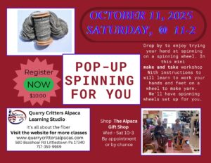 Check the drop down menu for dates and times. If you loved our mini make and take experience then please consider signing up for the 3 week course to learn more about spinning.