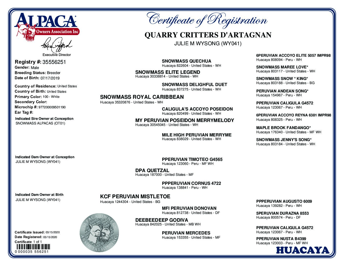 d’Artagnan of Quarry Critters alpaca ranch has started his breeding career 2025.